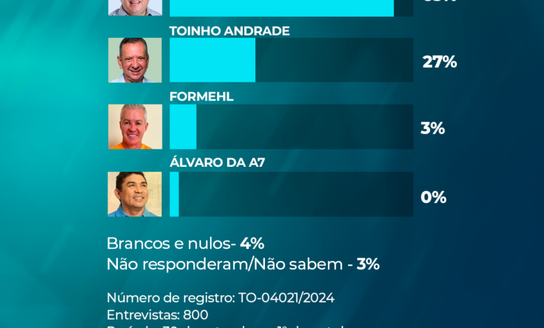 A pesquisa ouviu 800 pessoas no município entre os dias 30 de setembro e 1° de outubro. Ela está registrada no TSE (Tribunal Superior Eleitoral) com o número TO-04021/2024. A margem de erro é de 3 pontos percentuais para mais ou para menos e 95% de grau de confiança.