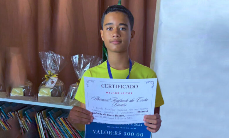O estudante Abimael Andrade da Costa Bastos, 14 anos, do 8º ano do ensino fundamental, da Escola Estadual Professora Augusta Vaz dos Santos Teixeira, localizada na cidade de Combinado, alcançou um conquista importante em 2024. Ele foi o aluno que leu mais livros, durante o ano letivo. Foram 325 obras lidas, e, com isso, ele ganhou o prêmio no valor de R$ 500,00. O incentivo à leitura e à produção de textos são ações que estão no Programa de Fortalecimento da Educação (PROFE), desenvolvido pelo Governo do Tocantins, por meio da Secretaria de Estado da Educação (Seduc).